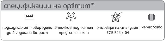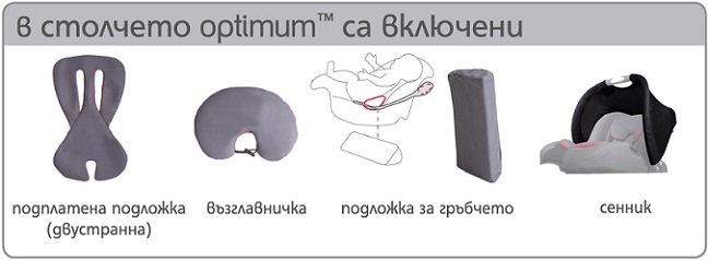Съдържание: 1бр. Столче за кола и количка optimum (кошница), 1 бр. основа на столчето, инструкция за употреба.