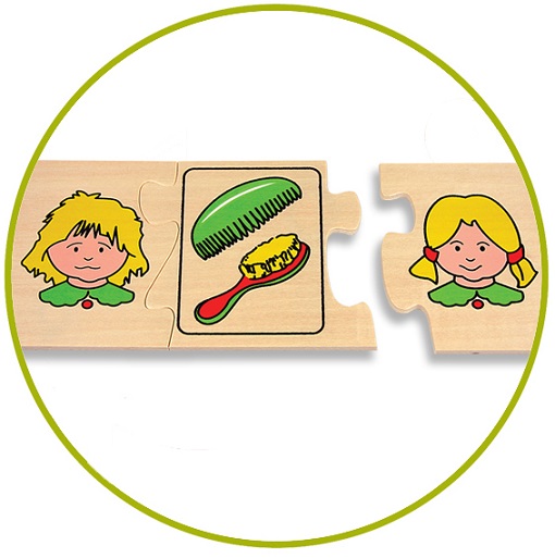 Комплектът съдържа : Десет пъзела, всеки с по три елемента, общо 30 елемента. За да подреди пъзела, детето се концентрира да разсъждава в правилна посока. Играчката развива у детето въображението, координацията око - ръка и му помага да играе в екип.